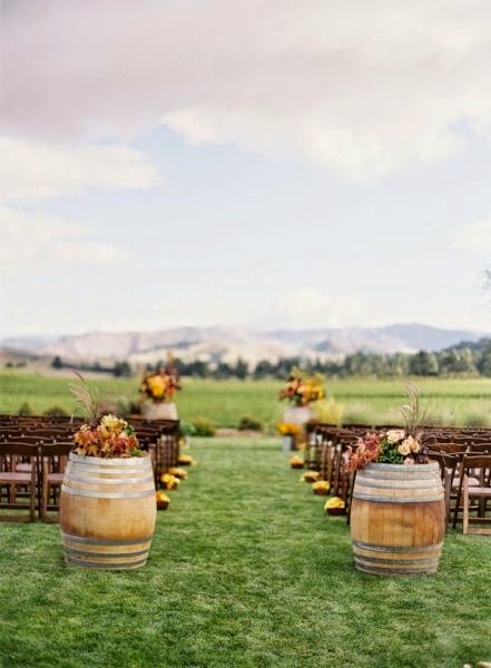 The colors of light hydrangeas surrounded by champagne gold and creams looks great! Imagine a light romantic wedding cake on top of a wine crate as your cake stand... that would be stunning!